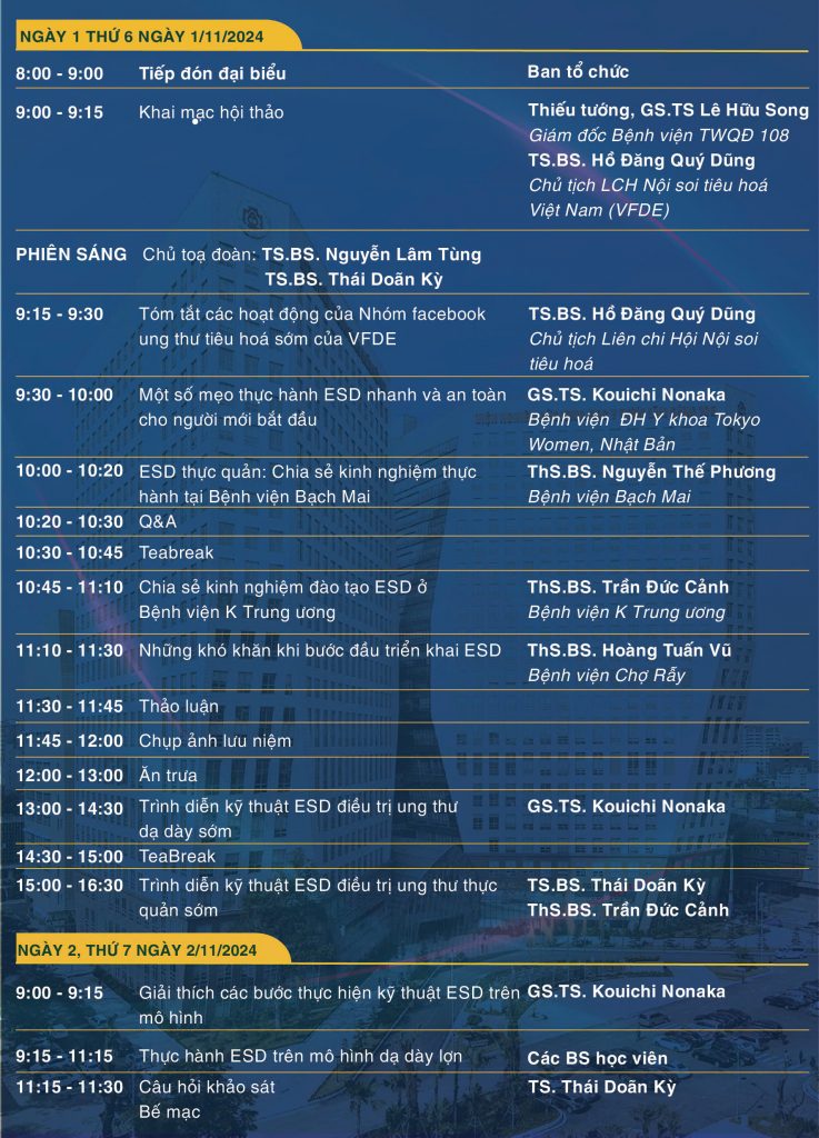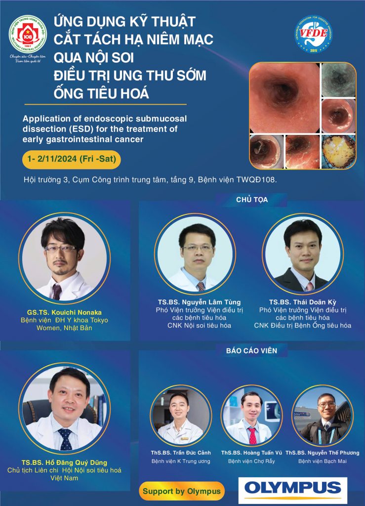 VFDE kính mời Quý đồng nghiệp đăng ký tham dự Hội thảo ” Ứng dụng kỹ thuật cắt tách hạ niêm mạc qua nội soi điều trị ung thư sớm ống tiêu hóa” được diễn ra từ ngày 01-02/11/2024 (thứ sáu và thứ bảy) tại Bệnh viện TWQĐ 108.