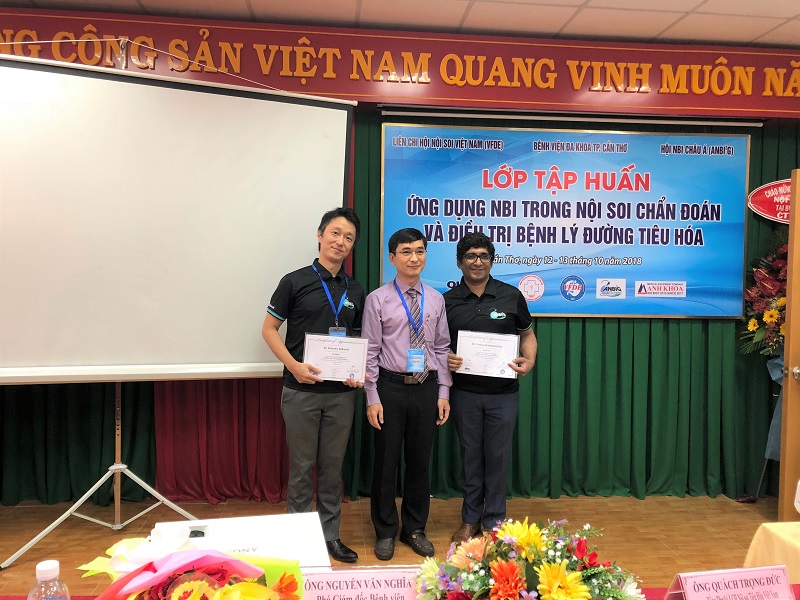 Trong hai ngày 12-13/10/2018, Liên Chi Hội Nội Soi Tiêu Hóa Việt Nam (VFDE) đã kết hợp Hội ANBIIG và bệnh viện đa khoa thành phố Cần Thơ tổ chức lớp tập huấn ANBIIG- ứng dụng kỹ thuật NBI trong nội soi tiêu hóa. Lớp tập huấn vinh dự có sự góp mặt của Ông Nguyễn Văn Nghĩa- Phó giám đốc bệnh viện đa khoa thành phố Cần Thơ, TS.BS. Hồ Đăng Quý Dũng- Chủ tịch Liên Chi Hội Nội Soi Tiêu Hóa Việt Nam, hai báo cáo viên nước ngoài cùng gần 60 bác sĩ chuyên ngành nội soi tiêu hóa đến từ các bệnh viện trong cả nước.