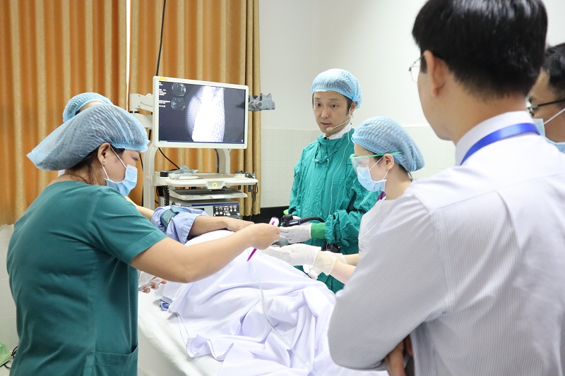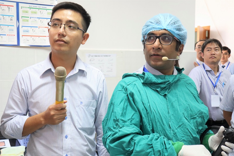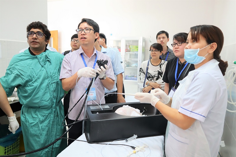 Trong ngày thứ hai của lớp tập huấn, Dr. Mohan Ramchandani đã báo cáo các chủ đề về điều trị nội soi ung thư sớm đường tiêu hóa và các tổn thương ung thư sớm đại trực tràng. Sau đó, các học viên tham dự đã được chia thành hai nhóm và thực hành trên mô hình dưới sự hỗ trợ của hai báo cáo viên.