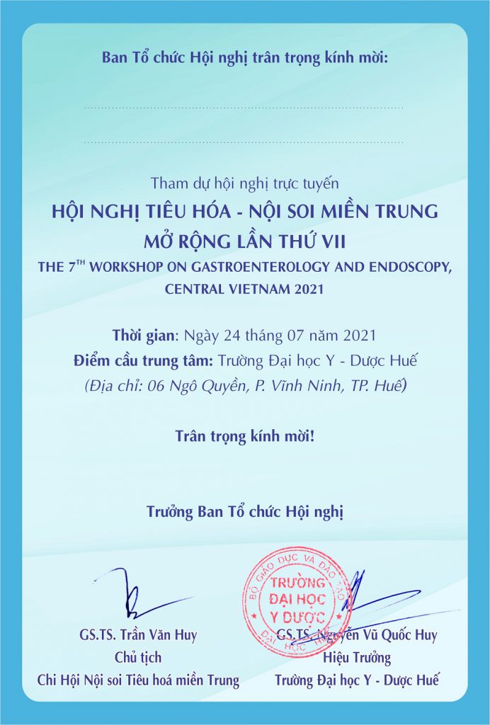 VFDE kính gửi đến Quý đồng nghiệp Thư mời của Hội nghị Tiêu hóa- Nội soi miền Trung mở rộng lần thứ VII, năm 2021. Hội nghị được tổ chức vào Thứ Bảy, ngày 24/7/2021 bởi Chi Hội nội soi – Tiêu hóa miền Trung kết hợp với Trường Đại học Y – Dược Huế.